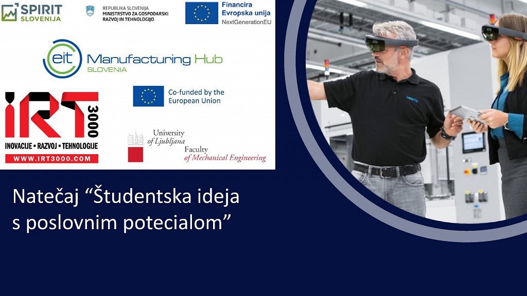 IRT3000 v sodelovanju z EIT Manufacturing Hub Slovenija in s podporo SPIRIT Slovenija vabijo na natečaj “Študentska ideja s poslovnim potencialom”, na katerega se lahko prijavi vsak študent / študentski tim, ki ima(jo) idejo / inovacijo s poslovnim potencialom na področju: