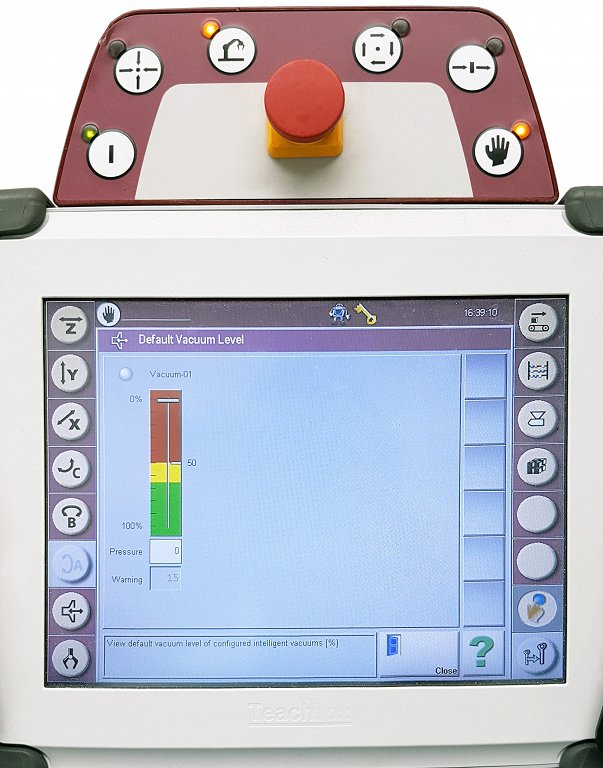 WITTMANN robots with an R8 control system can be flexibly programmed by the operator and adjusted to each specific situation concerning their response to parts loss. Previously, the WITTMANN R8 robot control system already allowed operators to set the vacuum level on the TeachBox for every individual suction circuit and to save these settings as a part of the process sequence. The individual feedback on possibly isolated cases of insufficient vacuum levels then enables the operator to set the optimal parameters for the specific surface structures of plastic parts. This makes it possible to respond to parts loss in a very specific way. The new vacuum analysis function now provides an additional advance warning system. Should the vacuum levels continue to deteriorate – which could be an indicator of increasing wear – a warning signal to that effect will be issued. The robot, however, can continue to operate until an actual part loss occurs, or ideally until early remedial action in the automatic system, which would prevent an unplanned machine standstill. WITTMANN W8 robots permit the support of eight vacuum hoses as standard, of which each one can be configured separately. The individual vacuum levels are imported via an analog measuring input and analyzed for the early warning system. The threshold values for early warning can be set by the operator. This function is included as a standard feature in the functionality of the R8 control system.