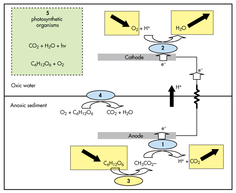 This is a schematic of a microbial photoelectrochemical solar microbial fuel cell (SMFC), a simplified mechanism generating electricity by the benthic microbial fuel cell (BMFC). Label 1 refers to the biofilm catalyzed anode reaction; label 2 to the biofilm catalyzed cathode reaction; label 3 to fermentative reaction; label 4 to the microbial oxygen barrier; and label 5 to the photosynthesis.
