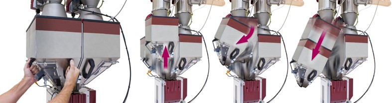 In recent years WITTMANN has been highly successful with the material hoppers of its GRAVIMAX blenders. Due to their sophisticated design, the hoppers are very easy to remove. The newly introduced designation SL, “Stationary Lid” stands for a lid firmly fastened to the blender, to which the material loaders can be attached. The hoppers can now be detached without having to remove the material loaders. Ease and comfort in working with the production equipment considerably enhances the satisfaction of operating staff and thus ultimately increases productivity.