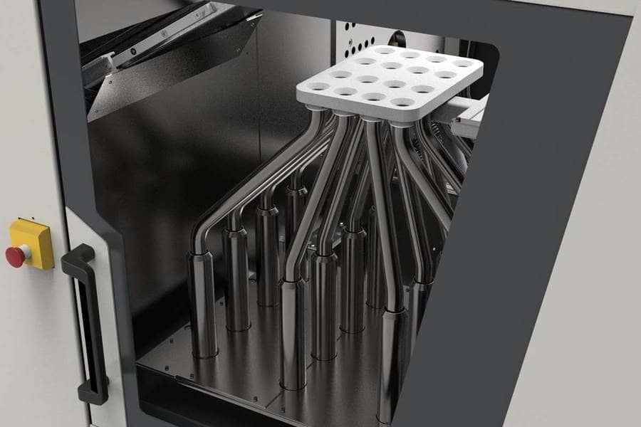 The precision parts will be manufactured from polystyrene on an ENGEL e-victory 170/80 injection moulding machine equipped with a 16-cavity mould by Fostag Formenbau (Stein am Rhein, Switzerland), taken off the mould by an ENGEL viper 12 linear robot and transferred to the distribution system. To ensure batch traceability down to the individual cavity, the filigree parts will be packed in cavity-specific bags. For this purpose, the 16 bags are hung in a cart located directly beneath the pipe distributor. Individual shots can be extracted for quality inspection purposes.