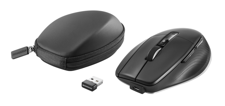 CadMouse Pro Wireless comes with a rechargeable lithium polymer battery, triple connectivity (Bluetooth® Low Energy, 3Dconnexion Universal Receiver or micro USB cable), a Smart Mouse Wheel 2 for precise click-to-click zooming in CAD applications with controlled speed scrolling in read mode, and much more. In keeping with its wireless, mobile pedigrees, it comes with a semi-rigid carry case for safe transportation.