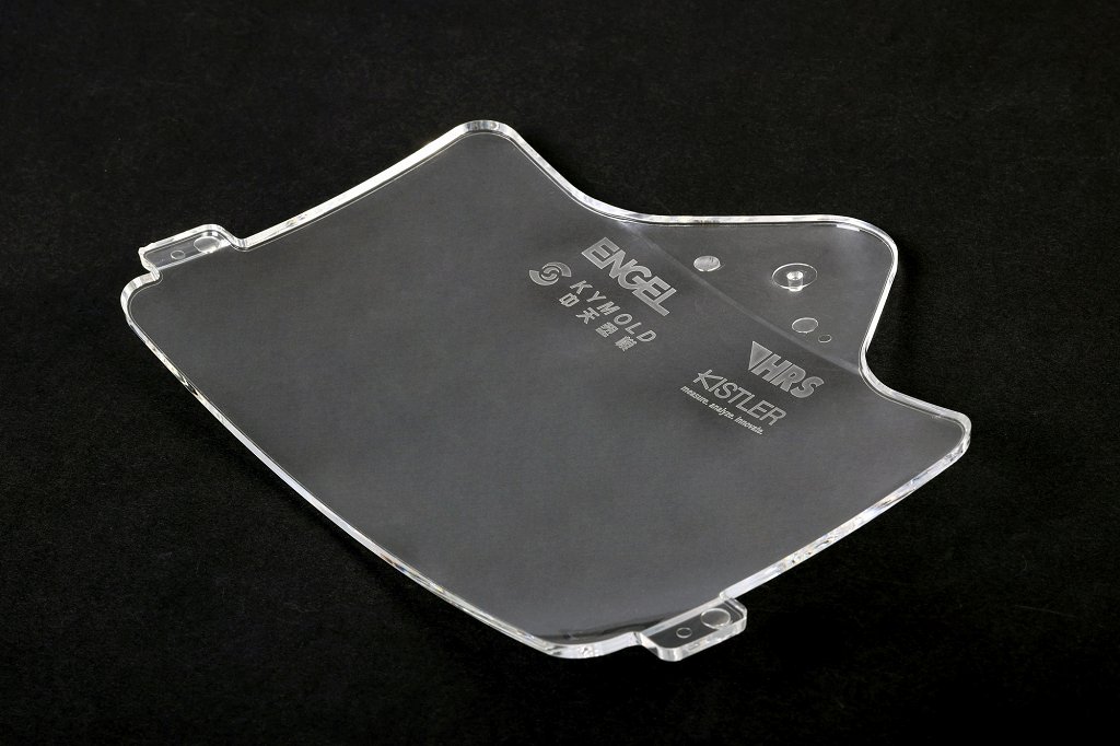 The production of mirrors for head-up displays of polycarbonate using a servohydraulic duo 2460/500 injection moulding machine calls for the highest precision moulding. Projecting a sharp display image on the vehicle windscreen depends on a perfect injection moulding outcome. The coinmelt coining process and the ingenious design of the dual-platen clamping unit both contribute to this. Platen parallelism is controlled by four individual pressure pads as the clamping force builds up. This ensures the precise parallelism of the mould halves throughout the injection moulding process when using coining. In this way, the coining process can produce asymmetrical components with maximum precision moulding. With low holding pressure, the melt is evenly distributed over the projected component surface. The material is protected, which is why coining is mainly used for optical parts made of transparent plastics. The convex head-up mirrors underline the high potential in this area. Here, the injection point is away from the centre of the component.