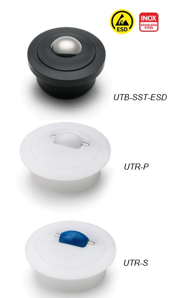 1To handle loads with delicate surfaces, Elesa+Ganter offers UTB-P ball transfer units with main ball in acetal-based technopolymer; while for loads with sharp and angular surfaces UTB-SST with ball in stainless steel is available.