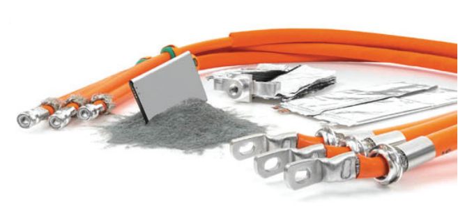 Sljedeći primjer je sigurno zavarivanje dvaju raznolikih materijala – poniklanog bakra i aluminija. Aluminijski kabel presjeka 200 mm2 se pouzdano zavaruje s debelostijenim cijevnim kabelskim uzicama od poniklanog bakra. Ono što predstavlja poteškoću za uobičajene postupke, pouzdano uspijeva Telsonicovoj tehnologiji PowerWheel®. U postupku torzijskog ultrazvučnog zavarivanja se s velikim unosom energije u kratkom vremenu spajaju aluminijski vodič i bakreni kontakt. Postupak PowerWheel® omogućuje, da se u vrlo kratkom vremenu ostvari pritisak zavarivanja do 8000 kN i da se kroz debelu stijenku kabelske uzice u zonu spajanja provodi snaga od 10 kW, koja ostvaruje čvrsti spoj. Torzijski postupak naravno daje najbolje rezultate kod pripremaka za zavarivanje valjkastog oblika. Kod okruglih čepova, obruča i vijaka, moguće je primjenjivati sonotrode, koje na sredini imaju rupu, što ne omogućuje niti jedan drugi postupak. Automobilski proizvođač tako zavaruje čelični čep, koji je utisnut u vitku od bakar-nikla, te prednji kraj aluminijske sabirnice za kontakt sa starterom. Zavareni spoj bez prekida potpuno okružuje čep. Postupak, koji se izvodi u automatiziranom proizvodnom procesu osigurava zahtijevane kratke cikluse i velik broj proizvoda.