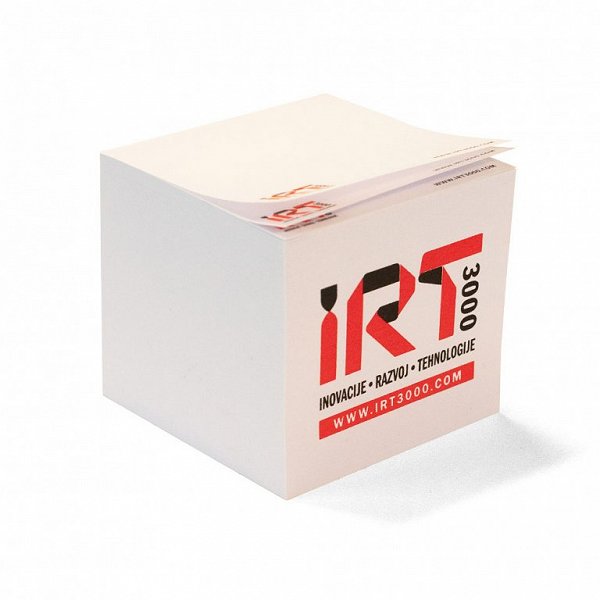 Kocka z lističi za opomnike (9 cm x 9 cm x 8,5 cm). Beli lističi z rdeče-črnim potiskom IRT3000 so kot nalašč za pisanje opomnikov.