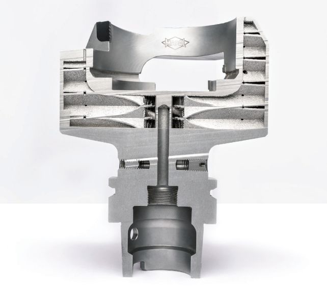 Primer, kako podjetje Mapal v praksi uporablja prednosti 3D-tiskanja, je novo zvončasto orodje z vgrajenimi PCD rezalnimi plo- ščicami. Zvončasta orodja se med drugim uporabljajo za zunanjo obdelavo cevnih povezav. Take povezave na turbopolnilcih morajo dosegati zahteve glede kompleksne konture, pri čemer mora obdelava zagotavljati ustrezno natančnost. Obstoječi procesi so prav tako podvrženi neprestanim izboljšavam, tako da je obdelava cenovno učinkovita in zanesljiva tudi pri serijski proizvodnji.