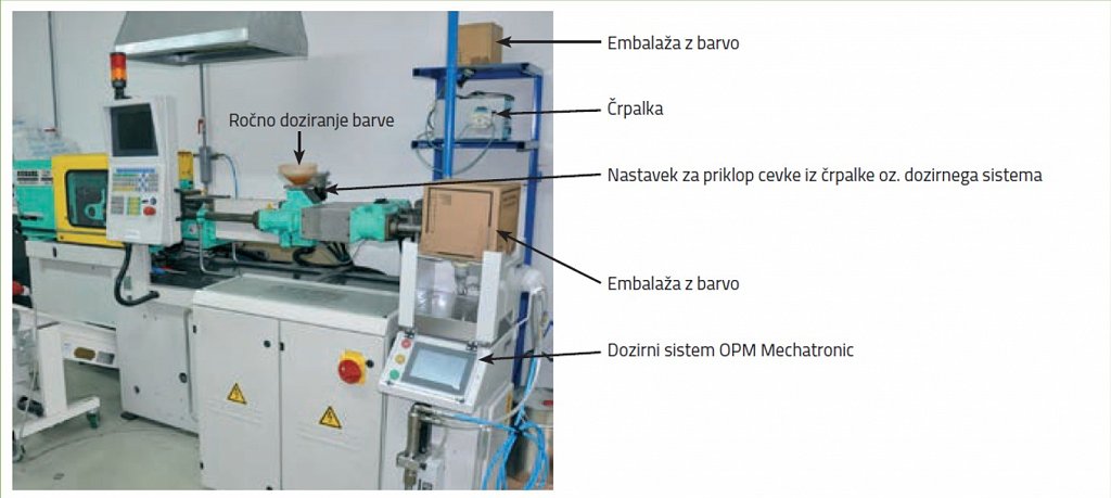 Uporabljamo osnovna tekoča barvila podjetja Novosystems GmbH iz Nemčije, ki je na področju tekočih barvil že od leta 1984 poznano po lastnostih in kvaliteti izdelkov. Tekoča barvila za barvanje plastike so uporabna v skoraj vseh standardnih in v veliko tehničnih polimerih, imajo široko paleto barvil in toplotno obstojnost do 350°C. So vodotopna in se jih lepo izpere z vodo, vendar ne vsebujejo vode in se zato ne morejo posušiti. Z granulatom tvorijo homogeno zmes, zato je porazdelitev na polžu enakomernejša, kot pri masterbatchih ali barvnih praških. V primerjavi z masterbatchi je pri procesu brizganja za menjavo barve potreben krajši čas, s čimer se poveča produktivnost, dodatna prednost pa je manjša izguba osnovnega materiala ob menjavi barve. Običajno zadoščajo koncentracije med 0,1 – 2,0%, odvisno od materiala in barve, povprečna doziranja pa so med 0,6 - 0,8%.