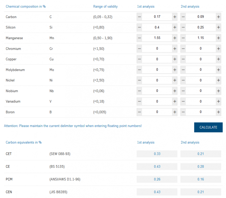 Izračun ogljikovega ekvivalenta temelji na kemični sestavi uporabljenih materialov. Program izračuna ogljikov ekvivalent CET na osnovi smernice SEW 088:1993, ogljikov ekvivalent CE na osnovi standarda BS5135, ekvivalent PCM po Ito-Bessy-u v skladu z ANSI/AWS D1.1-96, ter ogljikov ekvivalent po standardu JISB8285.