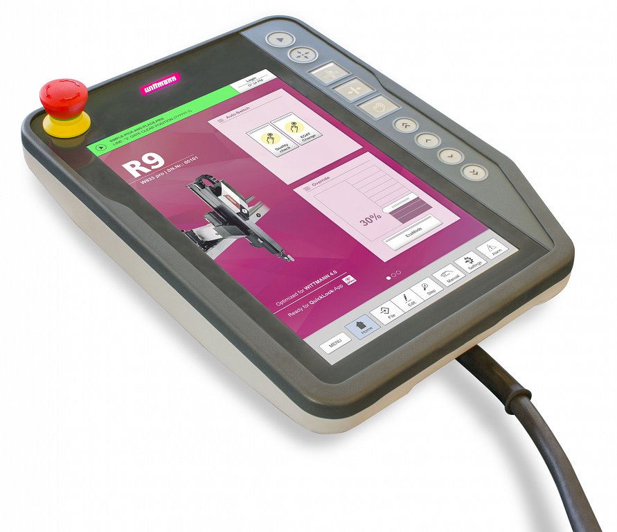 R9_linksNajočitnejša razlika je spremenjena oblika TeachBoxa, ki ima ločljivost 1280 x 800 in diagonalo zaslona 10,1 palca. Oblika zaslona je zdaj pokončna, videz pa spominja na krmilnik UNILOG. Kombinacija kaljenega stekla in kapacitivnega zaslona na dotik zagotavlja tudi večjo mehansko stabilnost. Poleg zaslona na dotik ima R9 tudi membranske tipke. Statusni gumbi so oglati, gumbi za gibanje pa okrogli.