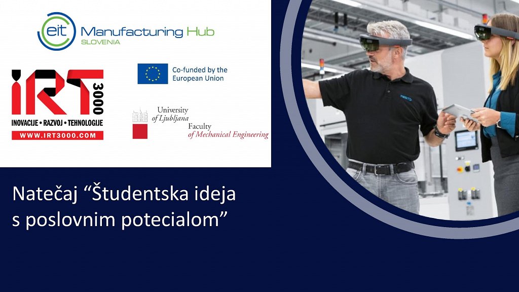IRT3000 v sodelovanju z EIT Manufacturing Hub Slovenija in s podporo SPIRIT Slovenija vabijo na natečaj “Študentska ideja s poslovnim potencialom”, na katerega se lahko prijavi vsak študent / študentski tim, ki ima(jo) idejo / inovacijo s poslovnim potencialom na področju: