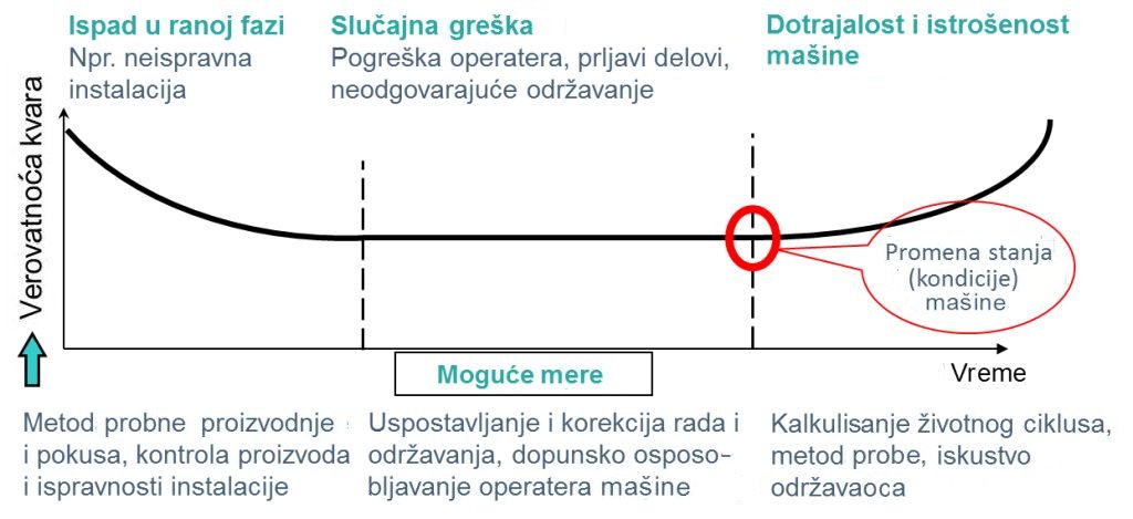 Prema grafikonu na slici 1, ispad je u prvoj (ranoj) fazi moguć zbog pogrešne montaže, u drugoj (već uhodanoj) fazi zbog slučajne greške (greška operatera mašine, prljavštine), a u trećoj fazi, gde ga je moguće sprečiti preventivnim održavanjem, zbog istrošenosti/dotrajalosti opreme. Mere koje se preduzimaju u prve dve faze mogu biti: kontrola proizvoda, probna proizvodnja, testiranje instalacije, dodatni trening zaposlenih ili korekcija procesa. U trećoj fazi ispad procesa može da se izbegne primenom dosadašnjih iskustava, kalkulisanjem životnog ciklusa - uzimajući u obzir različite parametre ili primenom senzora vibracije, koji je opisan u nastavku.