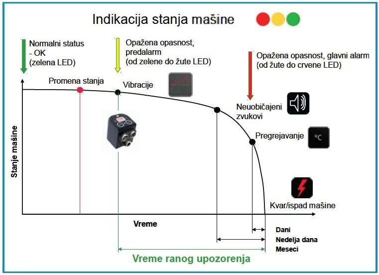 Jednostavna upotreba senzora moguća je korišćenjem tzv. „Teach mode“ funkcije, koja se uključi pri implementaciji senzora, a koja omogućava automatsko učenje, tj. snimanje krivulje optimalnog delovanja uređaja. Sa završetkom sekvence „učenja“ automatski se postavljaju pragovi za predalarm i glavni alarm. U tom trenutku „SCM Set“ već pri manjem nepredviđenom odstupanju apsolutnih vrednosti vibracija od optimalne krivulje delovanja daje rano upozorenje predalarmom. U nekim slučajevima, predalarmom može da se predvidii veći kvar uređaja mesecima pre pojave prvih prepoznatljivih znakova kvara, kao što su povećana buka i temperatura motora (vidi sliku 3).
