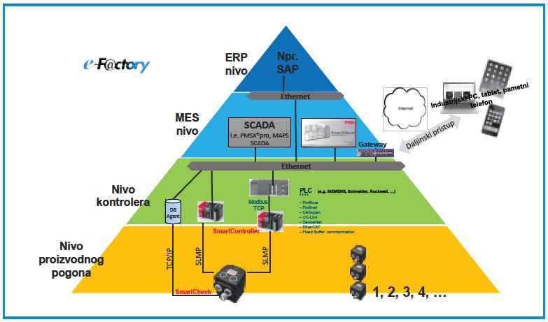 Opisano rešenje će sigurno u budućnosti postati jedna od vertikala Industrije 4.0 ili Interneta stvari. Na piramidi na slici 5 se vidi da je senzor vibracija važan za četiri nivoa. Na nivou proizvodnog pogona, senzor vibracija dobija informacije o tome šta se događa sa pogonom ili pogonskim uređajima. Informacija se dalje šalje u kontrolere i kroz odgovarajuće komunikacijske kanale dalje na nivo vizualizacijskih uređaja (MAPS / SCADA). Zaokružena celina, ili konačno odredište podataka dobijenih pomoću senzora vibracija je softver za planiranje resursa preduzeća (Enterprise Resource Planning – ERP).  Uz pomoć senzora vibracija moguće je efikasnije dobiti informacije koje će biti baza za procese odlučivanja u preduzeću. Takvo rešenje na nivou proizvodnog pogona pomoću naprednih funkcija automatskog učenja i auto-konfiguracije; pojednostavljena napredna dijagnostika, uz mogućnost sugerisanja uzroka kvara je vrlo jednostavna za korišćenje, a vreme potrebno za implementaciju je vrlo kratko. Rešenje za prediktivno održavanje je proširljivo na veći sistem, koji koristi SCADA/MAPS vizualizaciju. U slučaju potrebe, senzoru vibracija se može daljinski pristupiti preko RTU (Remote Terminal Unit) interfejsa, koji prenosi podatke posredstvom GSM/GPRS signala, ili preko TCP/IP komunikacije.