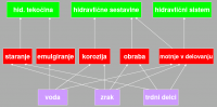 Sa slike: tekočina – tekućina, hidravlične sestavine – hidrauličke komponente, hidravlični sistem – hidraulički sistem, staranje – starenje, obraba – trošenje, motnje v delovanju – smetnje u delovanju, trdni delci – čvrste čestice