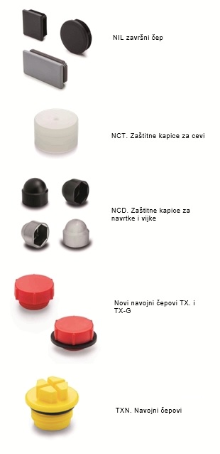 NIL završni čepovi od crne i sive termoplastike (polietilen, PE), polumat, prekrivaju oštre ivice ugaonih, četvrtastih ili okruglih cevi. Specijalna, unutrašnja rebra omogućuju jednostavnu i sigurnu montažu i demontažu, čak i kada cevi imaju različite debljine zidova.
